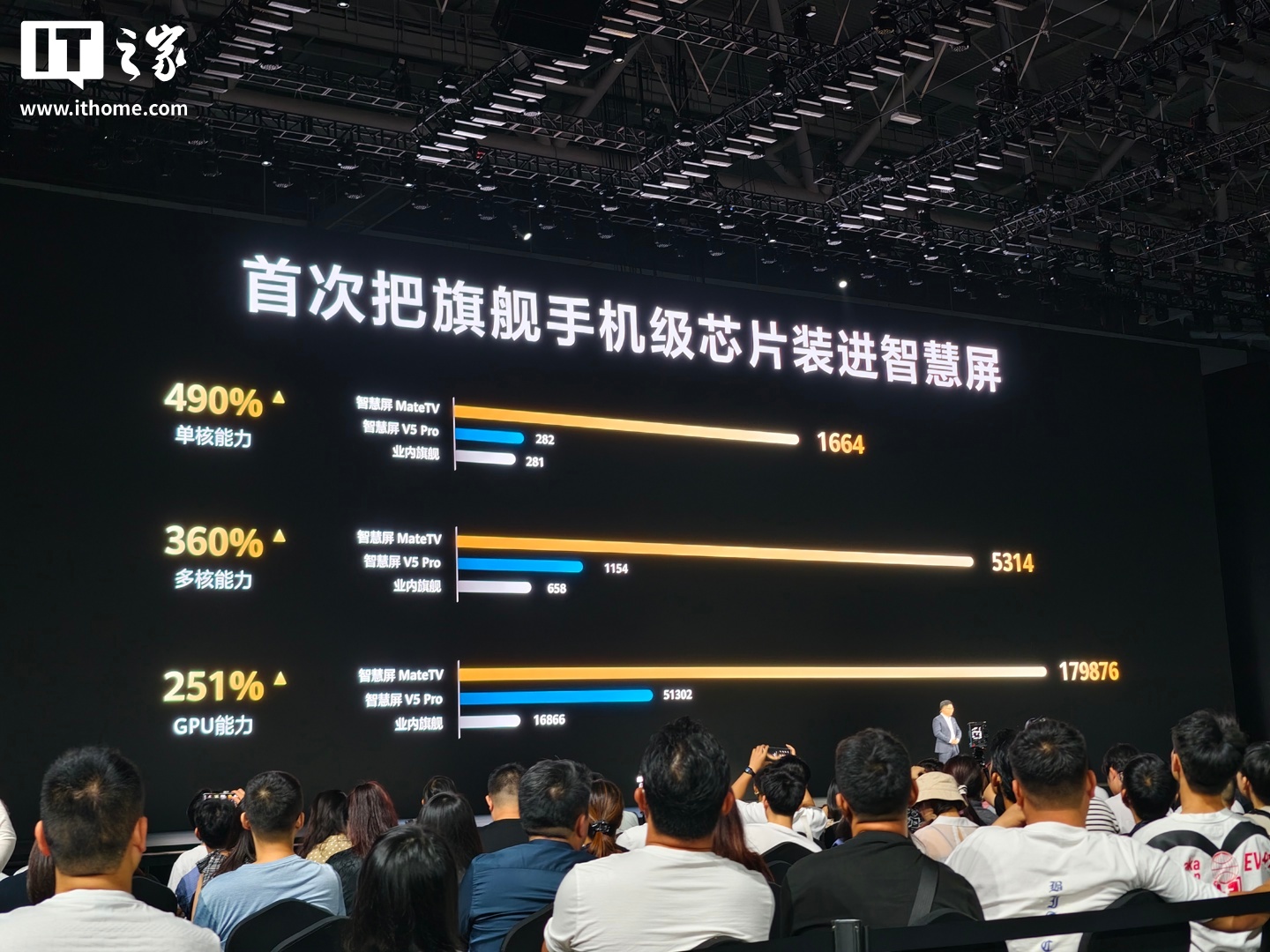 从华为 PPT 中放出的对比,华为灵敏屏 MateTV 初次把旗舰手机级芯片装进灵敏屏,单核才气普及 490%、多核才气普及 360%、GPU 才气普及 251%。